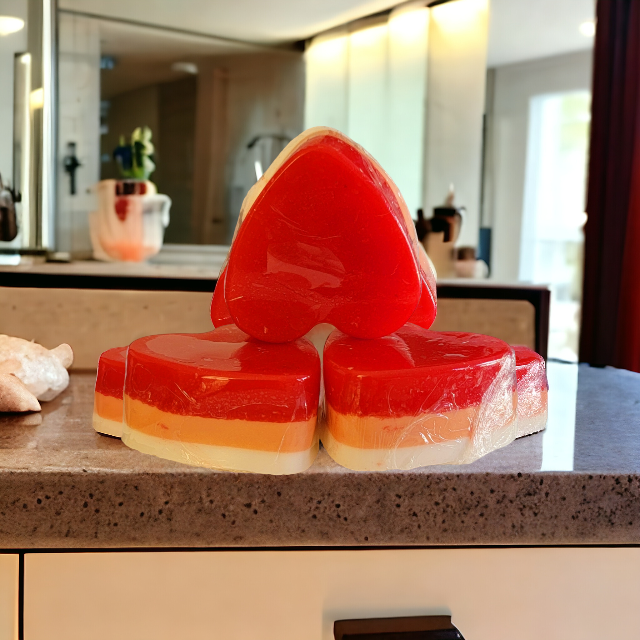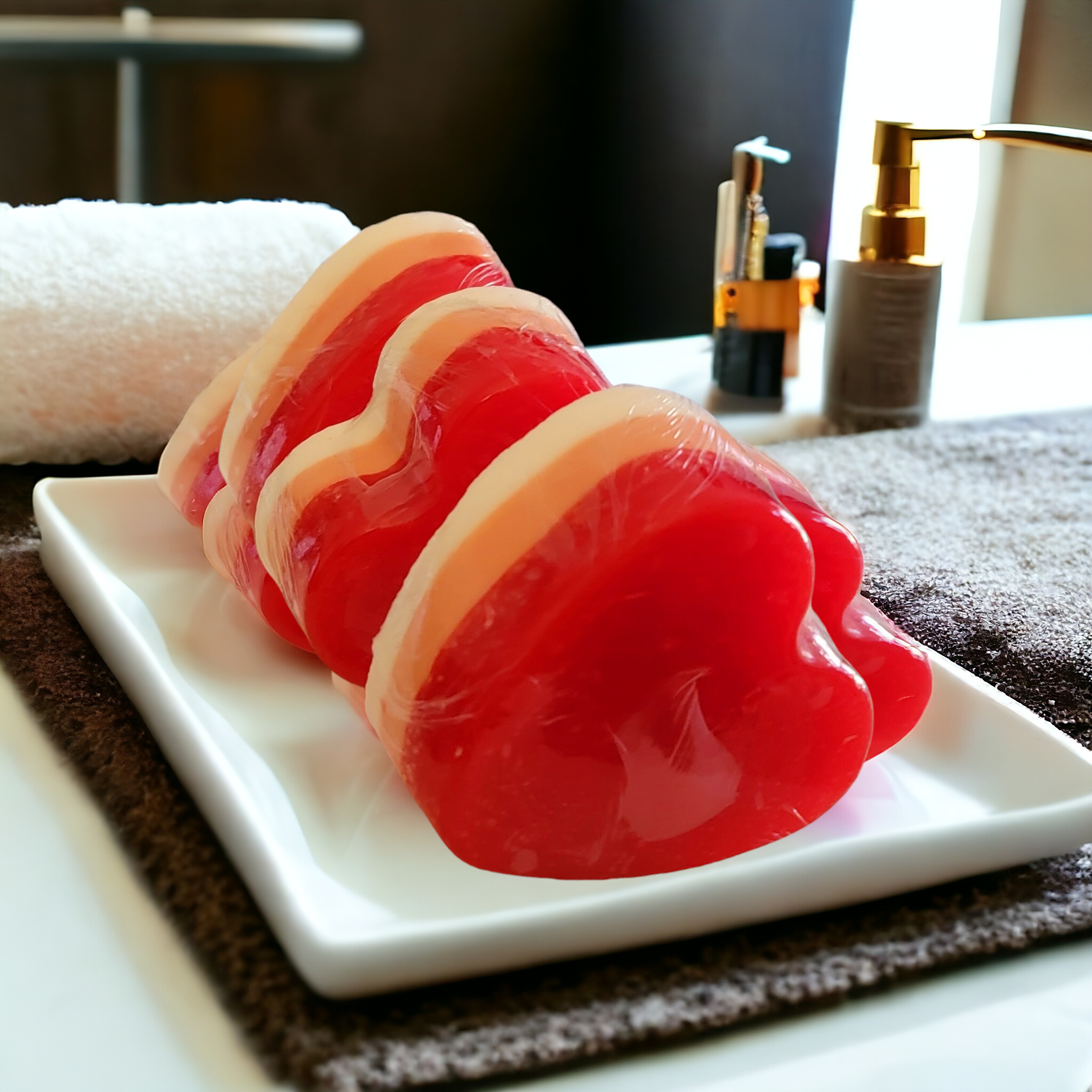 Goat’s milk, Shea butter, vitamins E, red ,pink cosmetic mica powder , roses essential oils